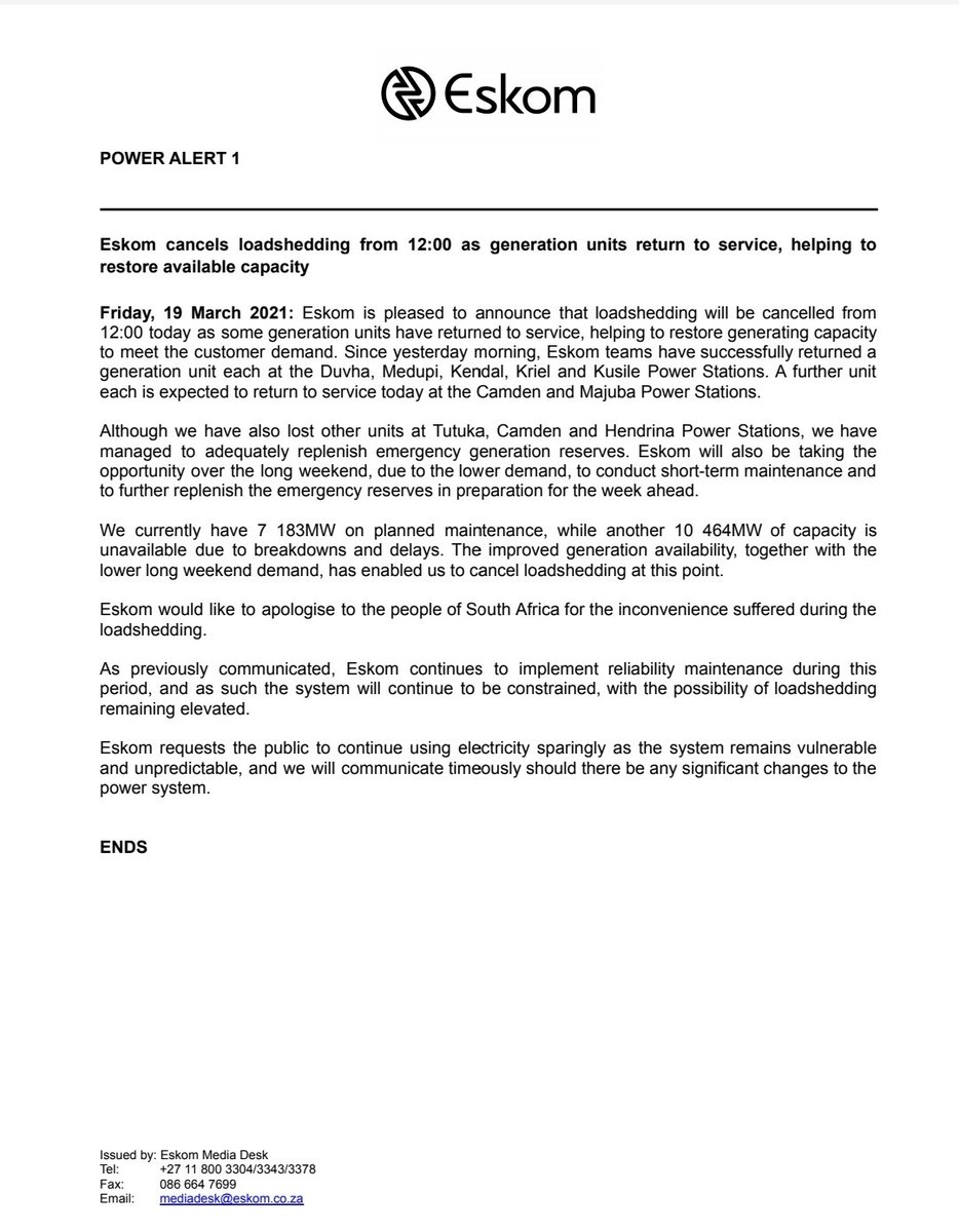 Impact on advertising in media: Eskom announced on tuesday that it would be implementing stage 2 load shedding, starting at 22:00 and ending on wednesday morning at 05:00. The shaded areas will indicate the times when loadshedding will be implemented during the selected stage. Eskom has started load shedding again. It started 12:00pm thursday, 14 january 2021 and will roll out until sunday, 17 january 2021.